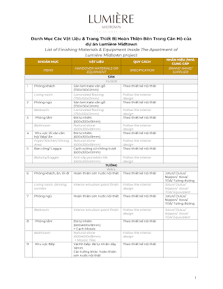 Danh Mục Các Vật Liệu & Trang Thiết Bị Hoàn Thiện Bên Trong Căn Hộ của dự án Lumière Midtown